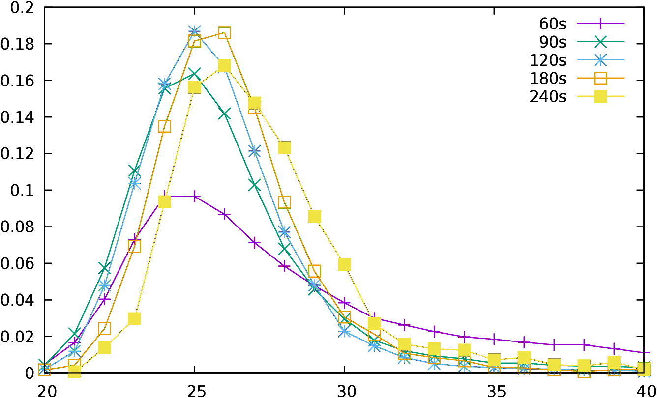 The red curve indicates for example that when a position is searched for 240s then 17% of the moves are evaluated at depth 26 (p(26,240)=0.17), and 3% only at depth 23 or at depth 31.