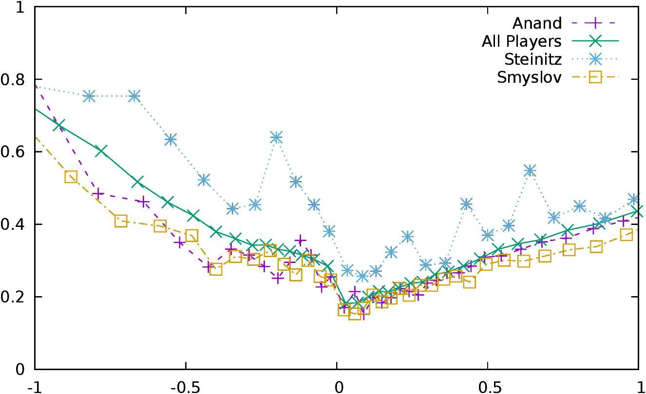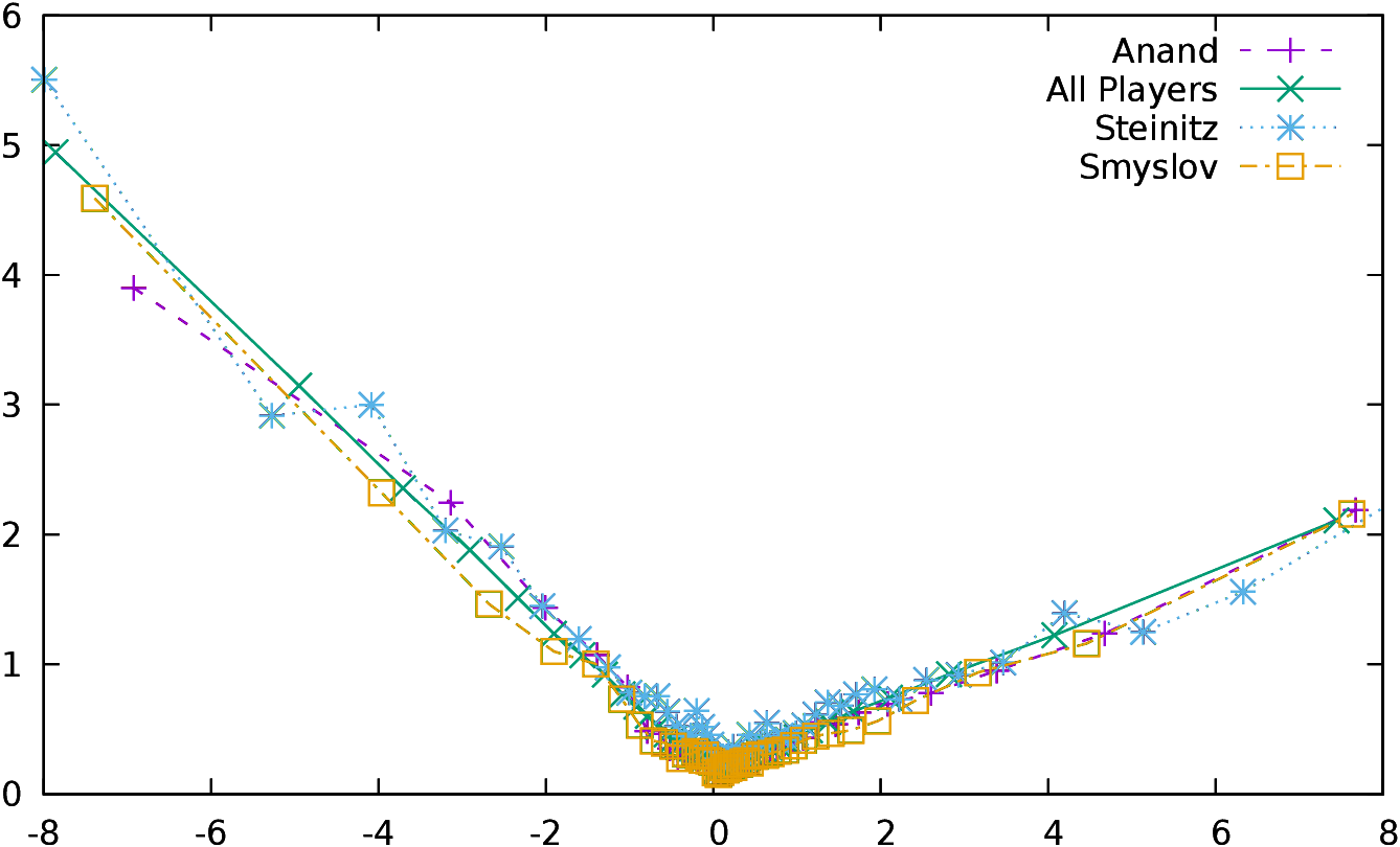 The curves of all players are extremely similar, and this is all the most surprising if we consider the “All Players” curve which represent all the players included in the study, i.e., the World Champions and their opponents11. Of course most of the players of this study are world class players, as World Champions usually do not play against club players, and the same plot would certainly be different with less strong players. The slope is not the same if y>0 or if y<0. Players are making bigger mistakes (that might be seen as “desperate maneuvers”) when they lose, than when they win. The relationship is not exactly a linear one: when we are close to 0 the positive slope is around 0.2, while it is 0.25 on the whole interval. The difference is even bigger for the negative slope, with a slope of -0.5 close to 0 and of -0.6 on the whole interval. However, the average of conformance for a position with a valuation of y can be approximated by avg(c(y))=a y + b, with b=0.18, and a=0.26 for y>0 and b=0.17 and a=−0.60 for y<0 (the values are computed for the “All Players” curves).