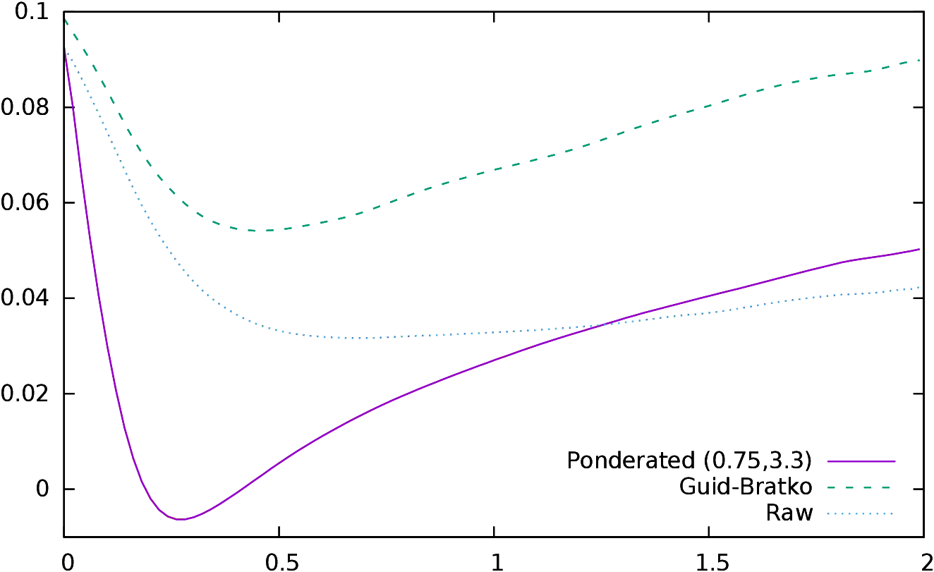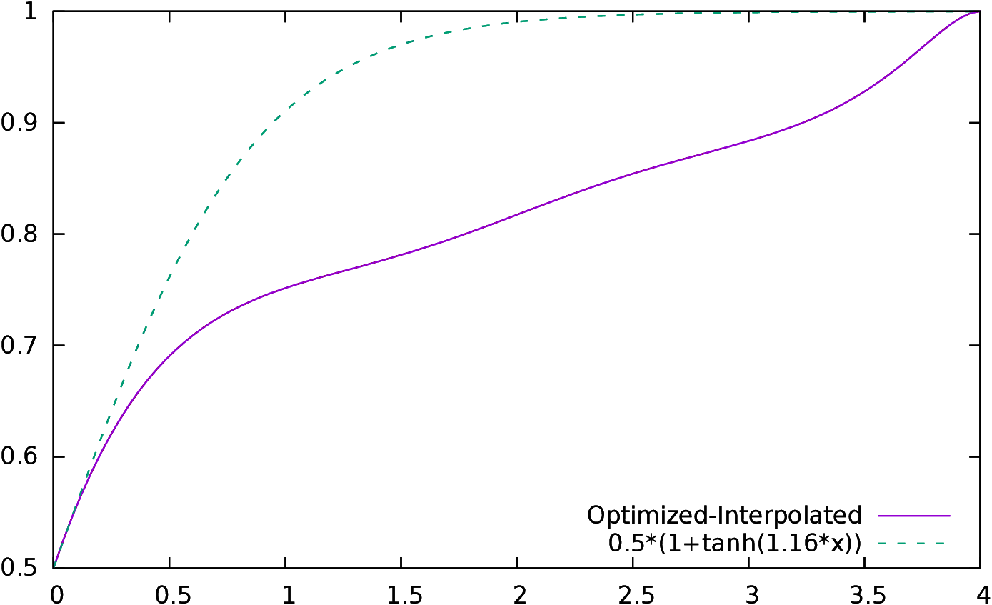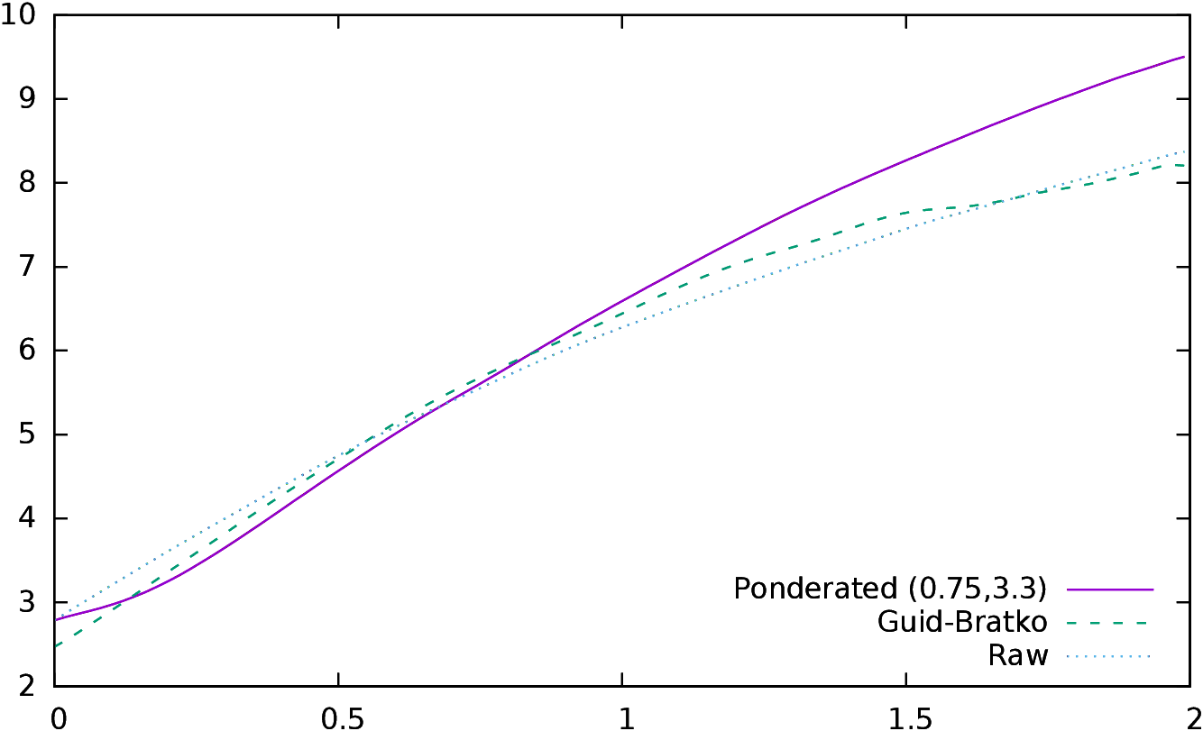 In order to validate these coefficients, a second optimization was performed, on 21 variables, two for k1 and k2 and 19 for fitting 19 points of a spline. Coefficients were set to 0.5 at 0 and to 1.0 at +4, and the 19 variables gave the value of the coefficient at (0.2,0.4,⋯,3.6,3.8). The other values were interpolated. The shape of the curve is quite different, however the correlation is only slightly better (0.879), and the mean, the standard deviation, α and β are similar (β is even higher). This means that, on the one hand, the correlation is not very sensitive to the parameters, and on the other hand that this indicator also needs to be “stretched” in order to predict the scores, just like the conformance indicator.