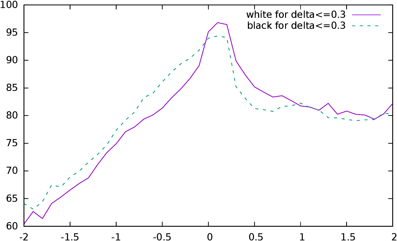 When plotting the difference of the raw accumulated conformance indicator for White and for Black, it is always positive (see left part of Figure 6). White is playing 61.1% perfect moves (x=0), while Black is only playing 60.2% perfect moves. The difference even rises for larger x and is maximal around x=0.25 where it reaches almost 2%. So, Black is in a way, making more mistakes than White. Why it is so is more difficult to interpret. We have already seen (subsection 3.2.3) that players are making more serious mistakes when they are in unfavorable positions; as Black is usually starting with a slight disadvantage, the same kind of psychological bias might encourage them to take more risks, and thus to make more mistakes. On the right side of Figure 6, we see that the distributions of White’s and Black’s conformance are different. White is performing better at 0 and slightly above, while Black is better below 0. This figure also confirms that while the level of play remains consistent when the evaluation of the position is positive, it is degrading fast for negative ones. We also understand why ponderated conformance corrects the bias: it is “stretching” differently the positive and the negative side of the curve because it is using two different constants to “bend” the distributions. The fact that the difference between White and Black is maximal around x=0.25 might be another reason why the accumulated conformance indicator has the best correlation around this value.