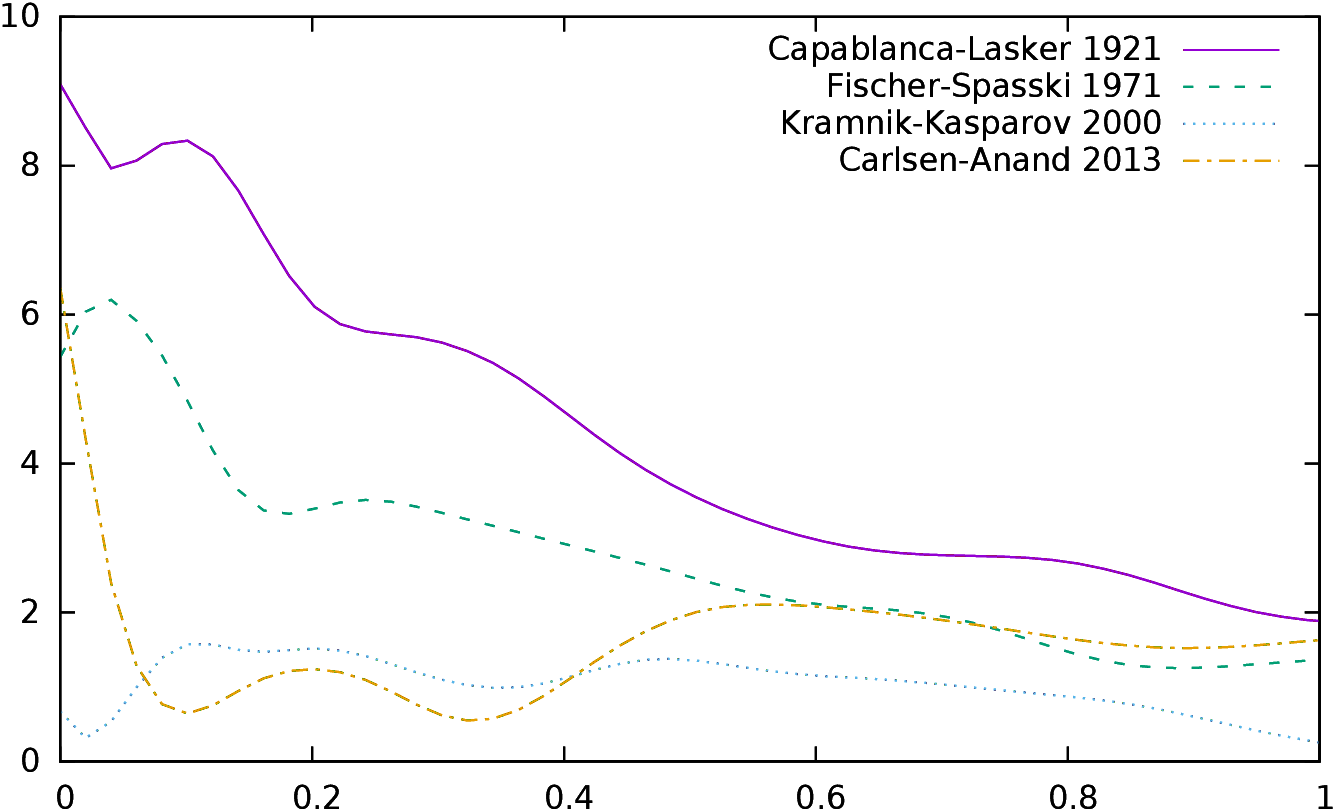 These values are approximately the same for all the World Champions considered in this study, except for Wilhelm Steinitz, who is clearly below. We also notice that they are well over the “All Players” curve34. The difference between 2.0 and 3.0 is small and thus a reasonable choice seems to be +2 as bsup. The same study with quite identical results can be done for binf. +2/-2 is also the value chosen as the limit of won/lost games by Guid and Bratko in their study, and these values give us sufficient moves in the extremal classes to have statistical consistent samples.
