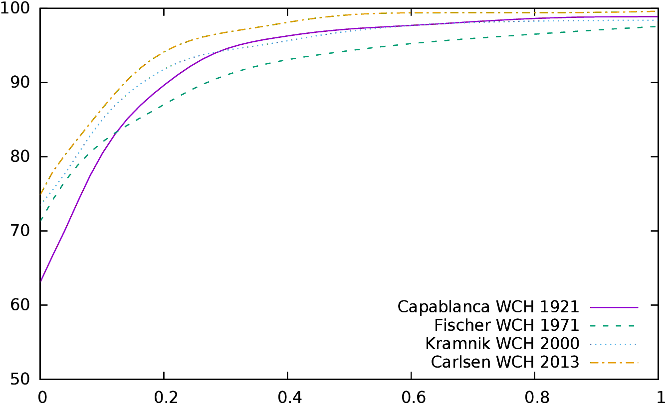 In Figure 8 we plot the performance of winners (left) and losers (right) during these four WCH. The performance by José Raul Capablanca in 1921 is definitely remarkable29: 63% of his moves were exactly those chosen by the computer (0cp), 81% were at a score less than 10cp of the move chosen, 90% at a score less than 20cp and 95% at a score less than 30cp. It took years to find other players able to perform so well in a WCH. It is however interesting to notice that the “conformance” of players has steadily raised. In 2013, Magnus Carlsen scored respectively 75% at 0cp, 86% at 10cp, 95% at 20cp and 97% at 30cp. For all championships from 2000 to 2013, all winners scored better than Capablanca at 0cp, and most of them scored better at 10cp, 20cp and 30cp. Kasparov lost the 2000 WCH while his performance was his best ever in a WCH, Kramnik was simply better.