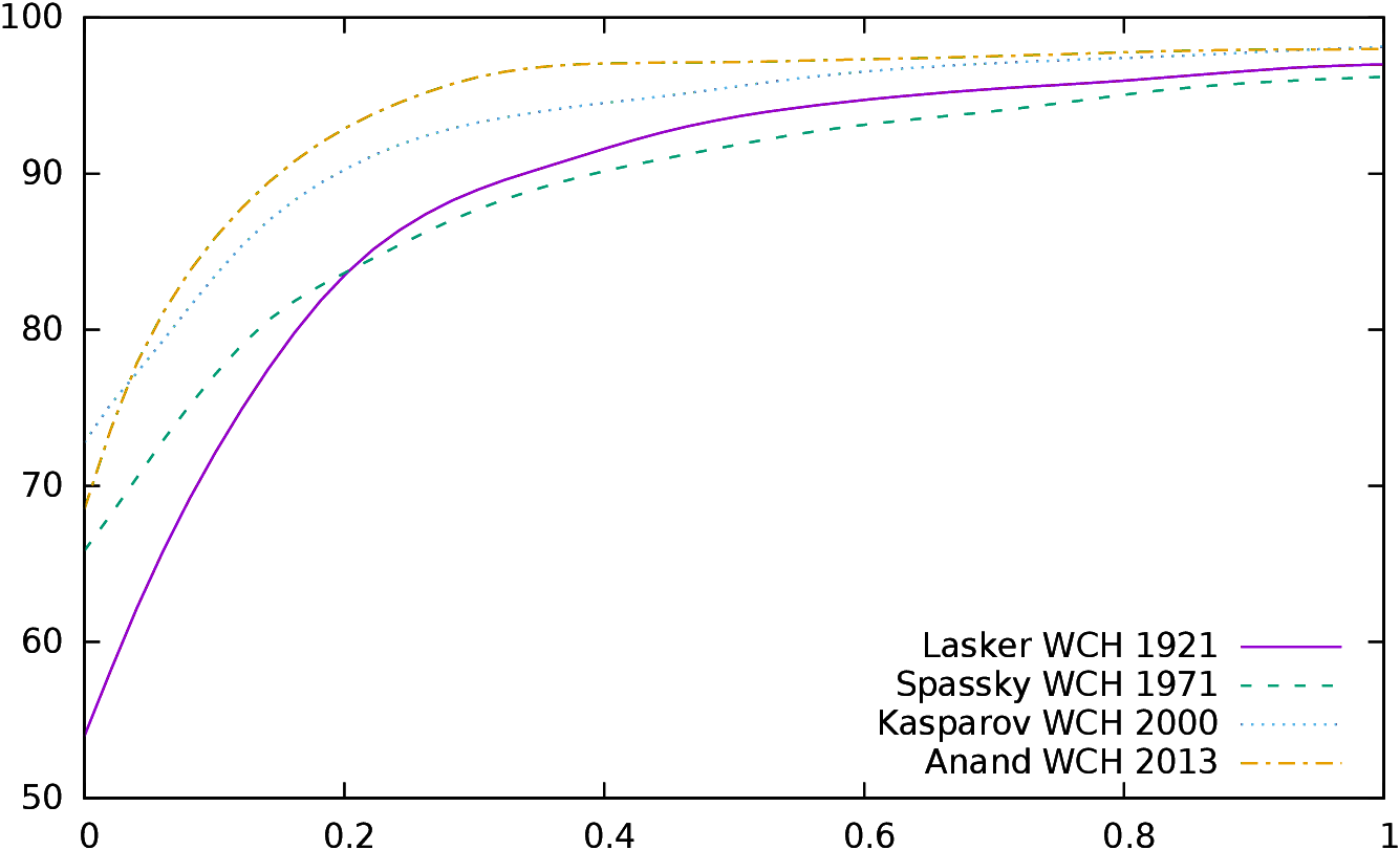 Championship Acs Covs MS AS ELOS Euwe-Alekhine 1935 57% 60% 61% 52% Alekhine-Euwe 1937 53% 51% 57% 62% Smyslov-Botvinnik 1957 50% 49% 51% 56% Botvinnik-Smyslov 1958 45% 48% 49% 54% Botvinnik-Tal 1961 49% 51% 52% 59% Petrosian-Botvinnik 1963 51% 58% 57% 57% Petrosian(2660)-Spassky(2670) 1966 49% 65% 45% 52% 48% Spassky(2690)-Petrosian(2650) 1969 48% 33% 54% 54% 56% Fischer(2785)-Spassky(2660) 1972 54% 53% 63% 63% 67% Kasparov(2710)-Karpov(2700) 1985 47% 46% 53% 54% 51% Kasparov(2710)-Karpov(2700) 1986 50% 51% 51% 53% 51% Kasparov(2720)-Karpov(2720) 1987 48% 48% 48% 50% 50% Kasparov(2770)-Karpov(2710) 1990 53% 55% 54% 52% 59% Kasparov(2820)-Anand(2720) 1995 51% 54% 50% 58% 64% Kramnik(2730)-Kasparov(2810) 2000 51% 48% 59% 57% 39% Anand(2800)-Kramnik(2785) 2008 50% 42% 52% 54% 52% Carlsen(2840)-Anand(2780) 2013 54% 54% 60% 65% 58%