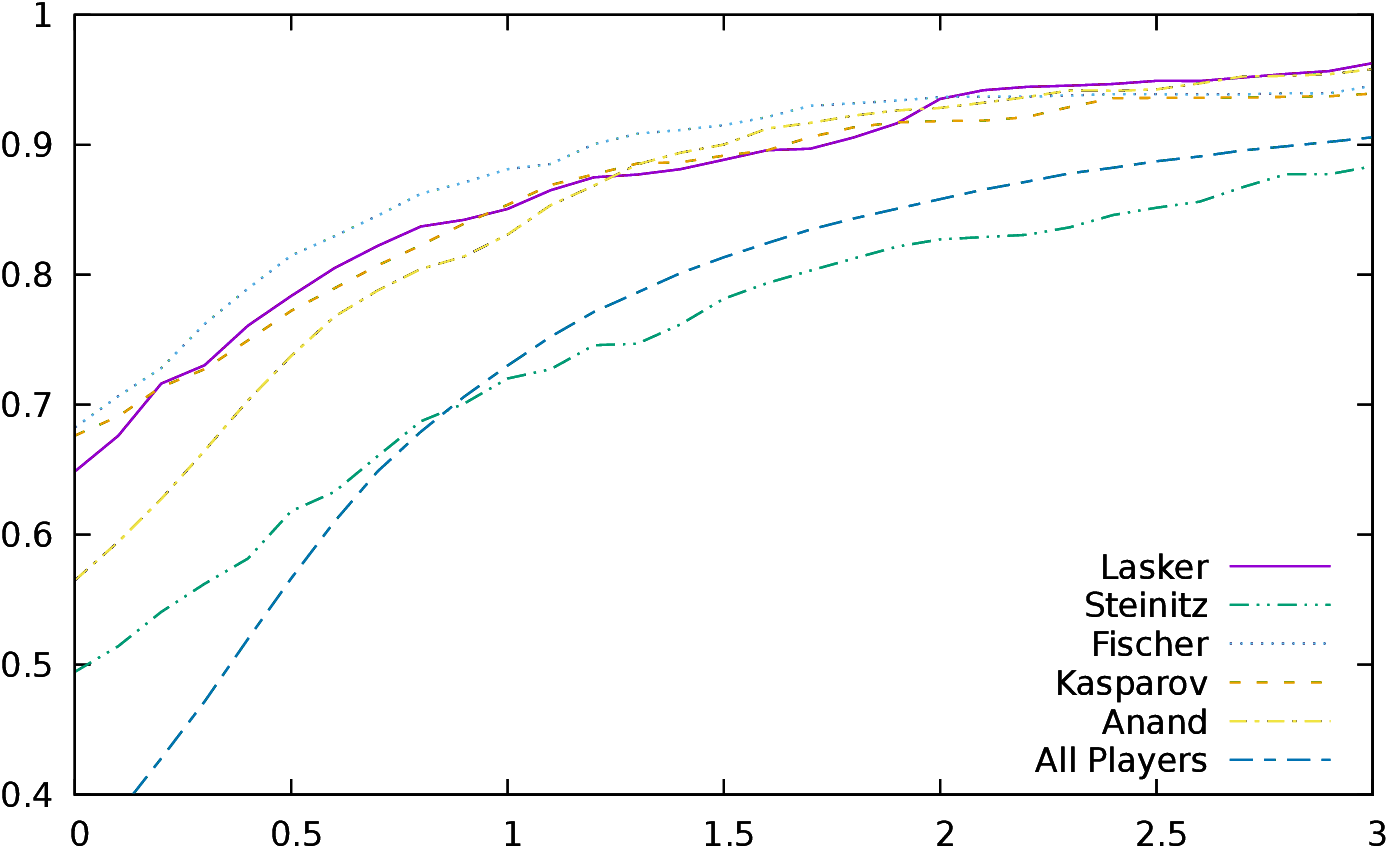 In Figure 13, we see for some selected players the expected value of the result as a function of the evaluation of the best position reached by the player during the game (the statistics are computed on all games). For example, if we consider Emmanuel Lasker, he won on the average 0.65 points when, during a game, he reached at least once a position valued 0. He won 0.85 points when he reached at least once a position valued 1.00 (100cp), 0.94 points for 2.00, 0.96 points for 3.0033. So we make an approximation of 0.06 points when setting bsup to 2.00, and an error of 0.04 points when setting it to 3.00.