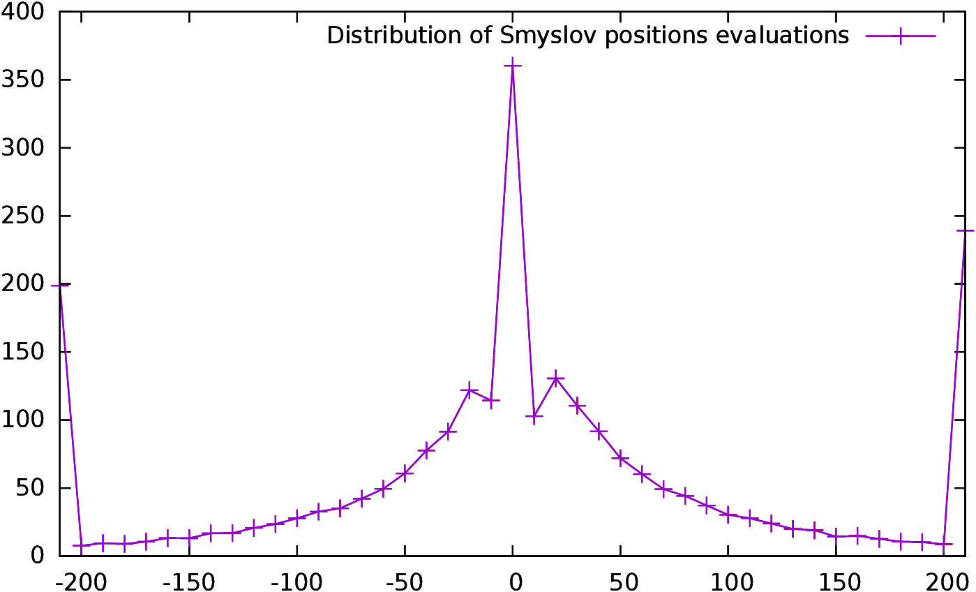 Figure 14 represents the distribution of the evaluation of the positions of Vassily Smyslov during his extremely long and competitive career. binf and bsup were set to -2/+2, and g was set to 10 centipawns. -210 represents all positions with an evaluation of -200 or below, -200 the positions with an evaluation between -200 and -190 and so on. There are 151,489 positions over 60 years, or an average of almost 2500 positions by year (5 times the limit of 500 moves).