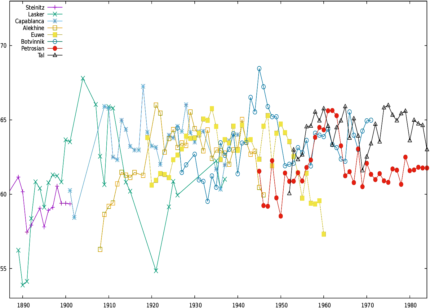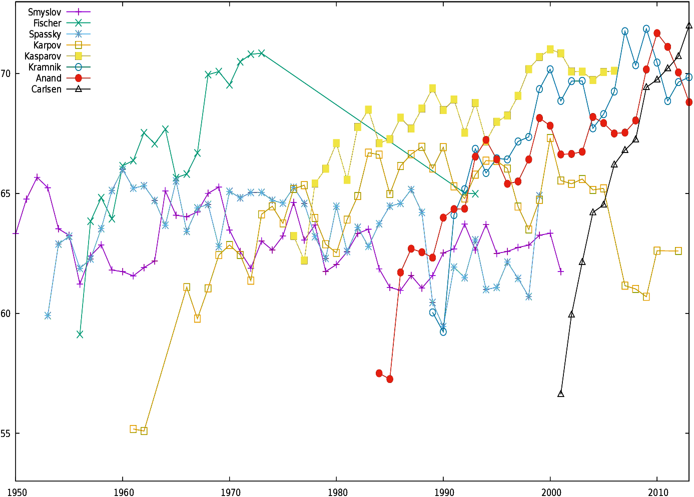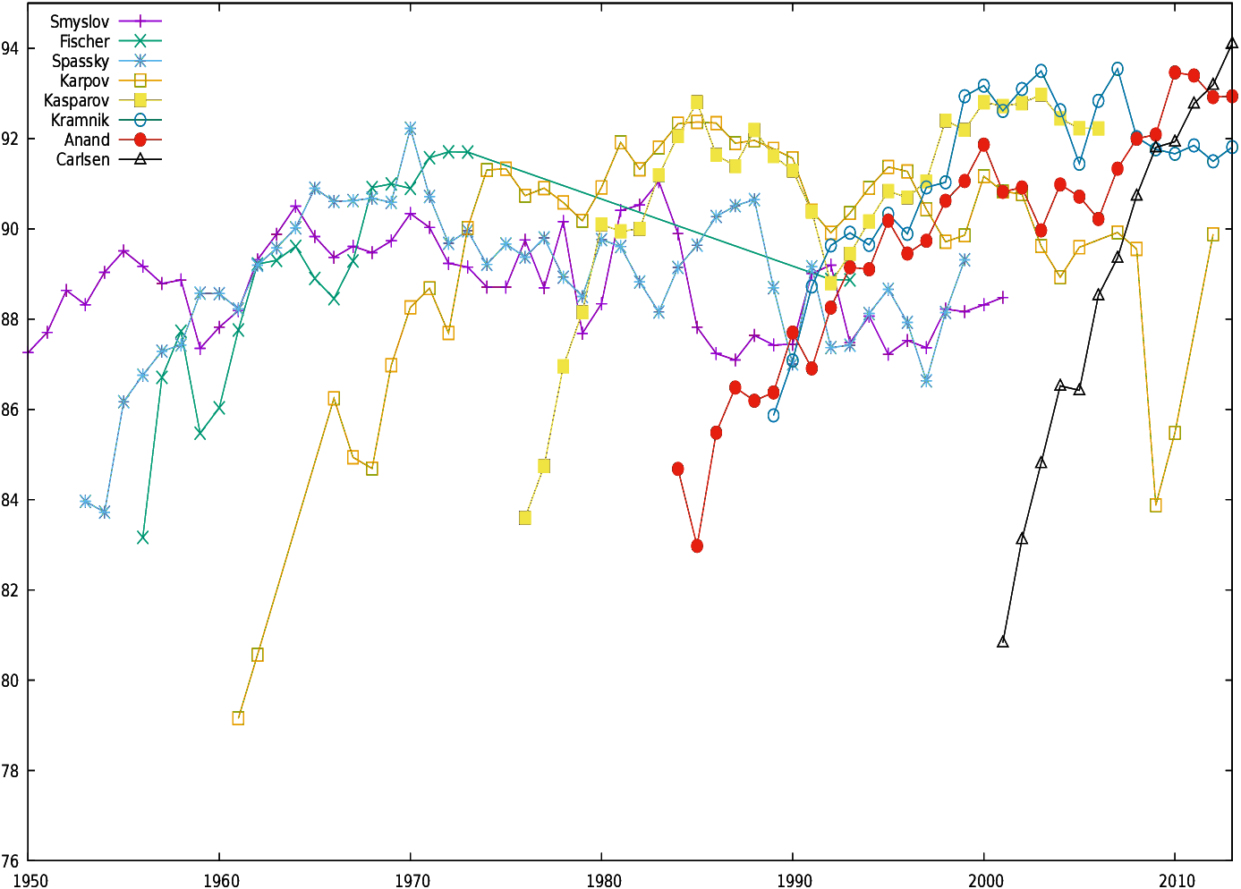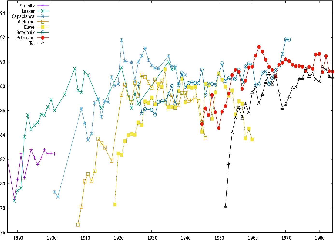 Twenty players were included in the study: Wilhelm Steinitz, Emanuel Lasker, José Raul Capablanca, Alexander Alekhine, Max Euwe, Mikhail Botvinnik, Vasily Smyslov, Mikhail Tal, Tigran Petrosian, Boris Spassky, Robert James Fischer, Anatoly Karpov, Gary Kasparov, Alexander Khalifman, Viswanathan Anand, Ruslan Ponomariov, Rustam Kasimdzhanov, Veselin Topalov, Vladimir Kramnik, and Magnus Carlsen.