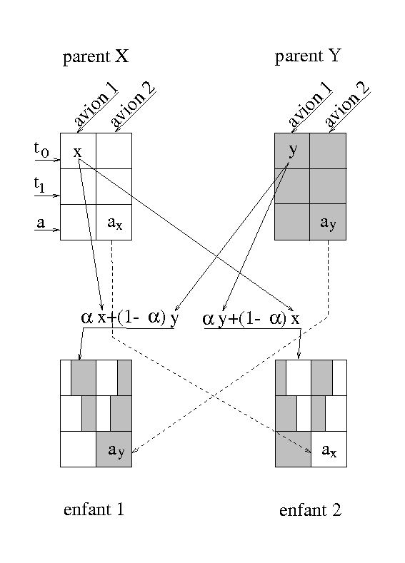 Ne pas prendre α dans [0,1] mais dans [−0.5,1.5] permet d’éviter de se restreindre au segment dont les extrémités sont les variables des deux parents.