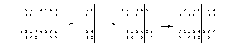 Passons maintenant au croisement. Un certain nombre de séquences de la population vont être remplacées par des croisements avec d’autres membres de cette population. Typiquement, de 25 à 75% des séquences sont laissées intactes, les autres étant remplacées par des croisements. Supposons que le sort désigne les séquences 1 et 3 comme devant être croisées et remplacées par les résultats du croisement. Il faut encore tirer aléatoirement un nombre entre 1 et 7 qui va désigner l’endroit où le croisement va s’effectuer ; supposons que ce soit 5. Le croisement est alors représenté sur la figure 1.1.