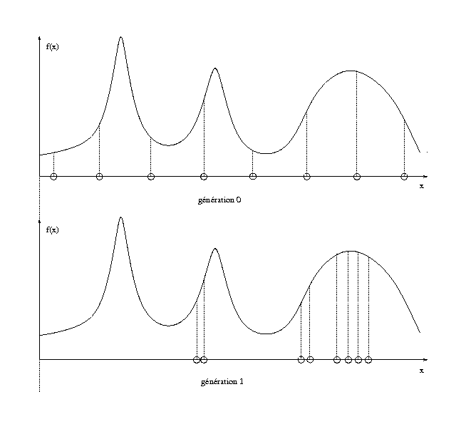On rappelle que les croisements et les mutations se font sur la population reproduite, et non sur la population initiale.