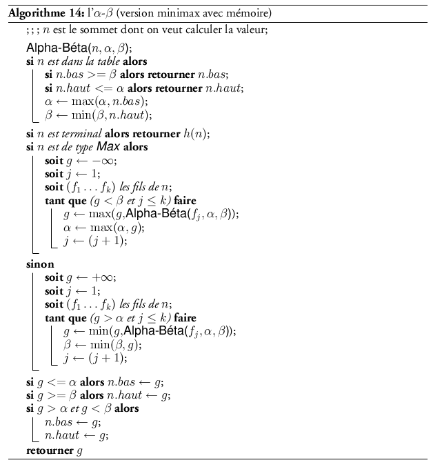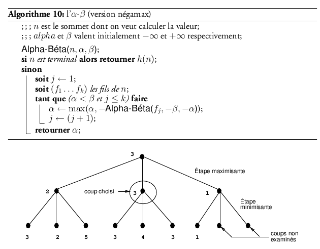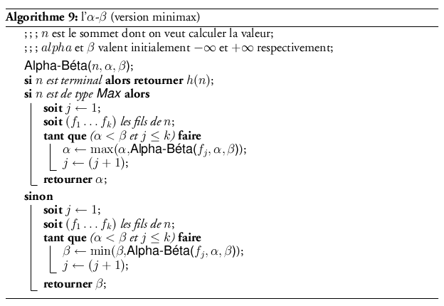 On constate que l’algorithme minimax doit complètement décrire l’arbre pour fournir une solution, ce qui, on le verra, est souvent excessif. L’algorithme alpha-beta11 est une amélioration de l’algorithme minimax qui réalise un élagage de certaines branches qu’il est inutile de visiter.