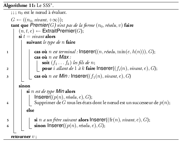 L’algorithme du SSS s’inspire de cette remarque. À partir du moment où une sous-stratégie optimale est établie (comme au point (6)), la stratégie optimale est marquée, et toutes les sous-stratégies sous-optimales supprimées de G. En voici la description précise. Nous noterons :