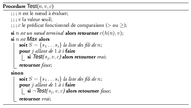Scout s’appuie donc sur deux procédures simples : la première, appelée Test  permet de vérifier si la valeur d’un nœud n est strictement supérieure (ou supérieure ou égale) à une valeur donnée v. Nous continuerons à désigner par h la fonction heuristique.