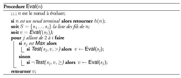 La seconde, Eval, utilise Test et applique le principe donné plus haut pour calculer la valeur minimax d’un arbre de jeu. Elle prend en paramètre un nœud n.