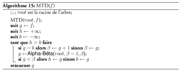 Ceci nous amène à l’énoncé de l’algorithme alpha-beta qui maintient ces deux valeurs durant le parcours de l’arbre (cf. Algorithme ??). Lors de son utilisation, on l’appellera par AlphaBeta(Racine,−∞,+∞).